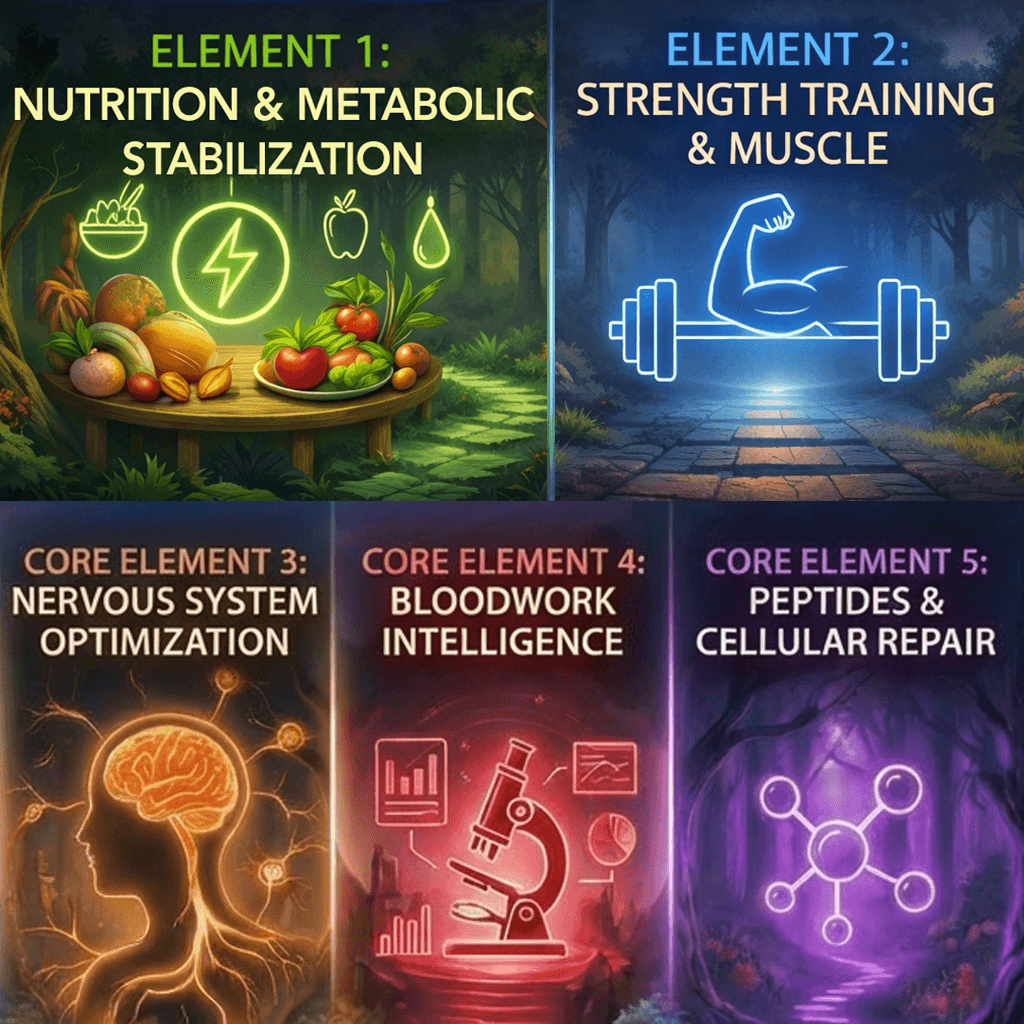 The specific protocols, the nutrition architecture, the training framework, the nervous system regulation system, the bloodwork intelligence, the peptide education — that is what the Core Elements Bundle is built to deliver.